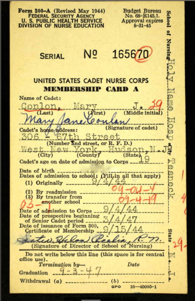 You can imagine my surprise at discovering on Ancestry.com her signed membership card for the United States Cadet Nurse Corps, dated 1944. The Corps was a government-sponsored nurse’s training program created to address the nursing shortage during World War II. As a student enrolled in an accredited nursing school, she automatically qualified for membership. I was not aware she had been part of the program, but Ellen, who followed her footsteps into the nursing field, remembered her mentioning it on a few occasions. On the thumbnail image accompanying the Ancestry entry I could just make out the translucent strokes of a fountain-pen signature. I clicked to enlarge the form and immediately recognized my mother’s measured Palmer-penmanship signature, with an extra flourish in the capital C of her maiden name “Conlon.” I knew it well. Halfway through my eighth grade year I had practiced to perfection the married-name version (a variation of my own) so I wouldn’t have to bother my mother to sign various school papers. That was in late winter 1976, and she was now mostly bedridden. The long shadow of her untreatable cancer touched all of our lives. Our waking hours consisted of greater parts care-giving than care-receiving, a trend that would only continue. Learning my mother’s signature was a consequence of that shift, my self-initiated solution to her diminishing parental presence. We all managed it in different ways.